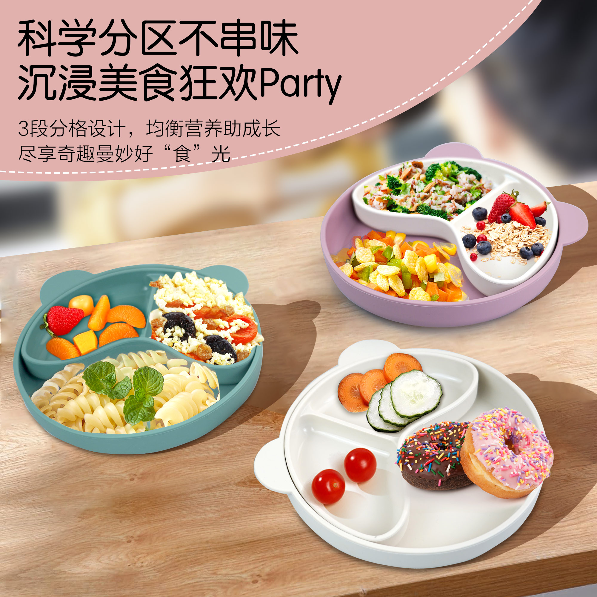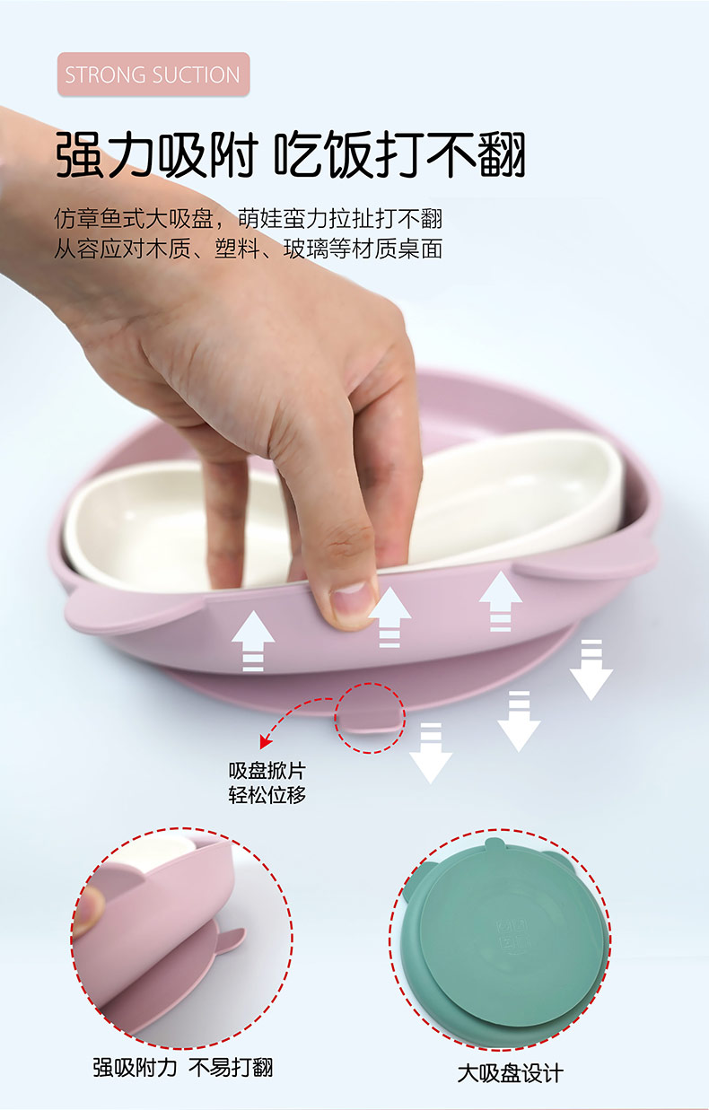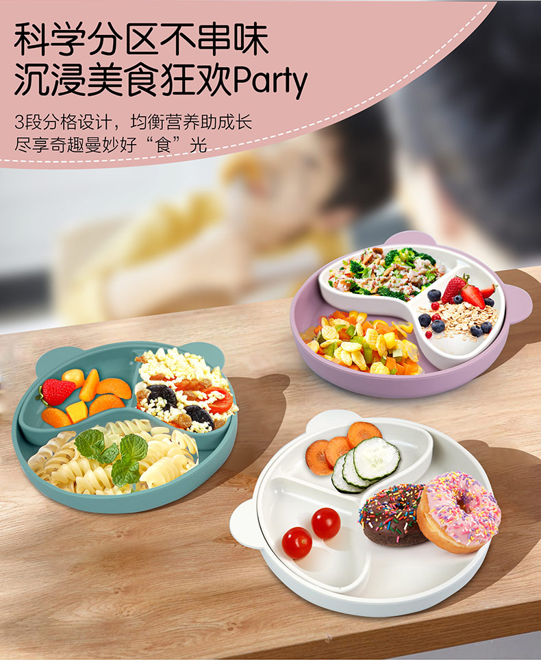 您的位置:首頁 > 產(chǎn)品中心 > 硅膠嬰童用品 > 硅膠碗 > 寶寶熱銷餐盤可拆分食品級硅膠分隔盤輔食吸盤三格兒童硅膠餐盤