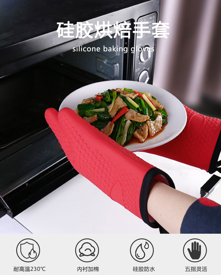 硅膠烘焙手套質(zhì)地柔軟,分指設(shè)計(jì),防滑防臟,內(nèi)置隔熱棉,有效保護(hù)雙手。