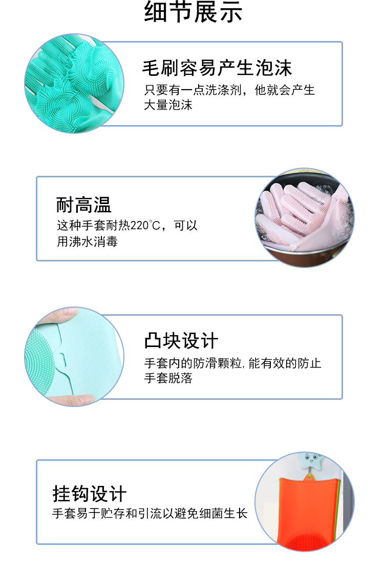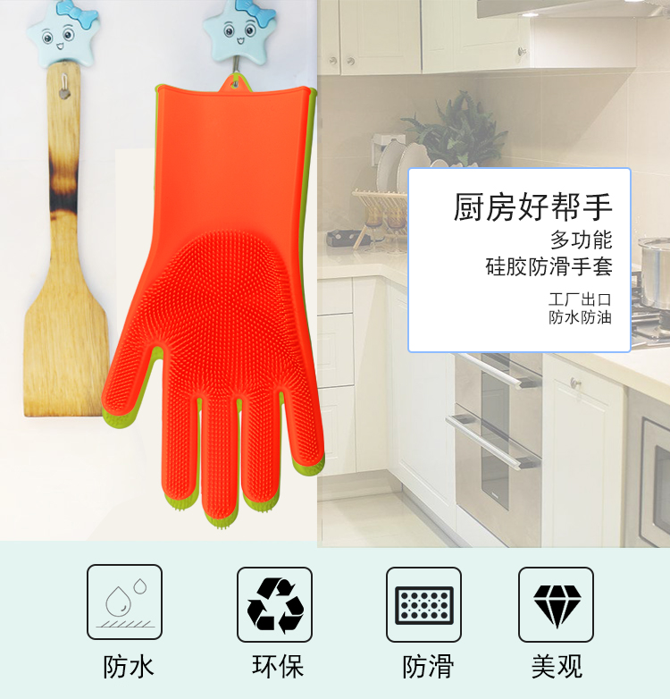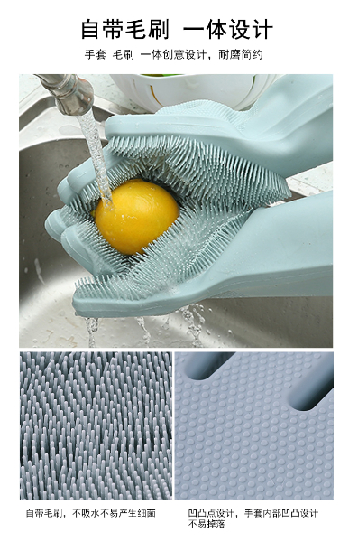 硅膠清潔手套是近年來比較火熱的廚房清潔用品。采用柔軟硅膠健康材質(zhì),手套正面有多重清潔刷頭,耐磨耐熱,強(qiáng)力去除污漬。